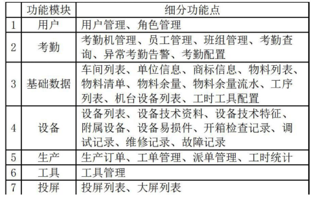 根據(jù)對閥門工廠的業(yè)務(wù)流程分析,結(jié)合該工廠的特殊需求,比如考勤、工時統(tǒng)計、工具管理等,本文確定MES軟件的功能點主要包括:用戶管理模塊、考勤模塊、基礎(chǔ)數(shù)據(jù)模塊、設(shè)備管理模塊、生產(chǎn)管理模塊、工具管理模塊、投屏模塊等。細(xì)節(jié)要求如圖2所示。
