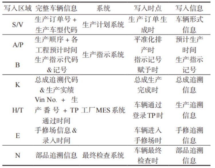 表 1 是車輛SF(日程文件)信息錄入的過程,簡單來說,就是在不同的生產(chǎn)階段在車輛SF的相應(yīng)區(qū)域中登錄車輛基本信息、生產(chǎn)信息和品質(zhì)追溯信息。