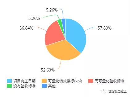 從反饋結(jié)果看,驗(yàn)收標(biāo)準(zhǔn)對(duì)“項(xiàng)目完工日期”的考慮是主要的,這可能與影響客戶生產(chǎn)相關(guān)聯(lián),影響的生產(chǎn)時(shí)間會(huì)直接反映在客戶產(chǎn)品的市場(chǎng)表現(xiàn)與營(yíng)收。其次是“可量化績(jī)效指標(biāo)(kpi)”。