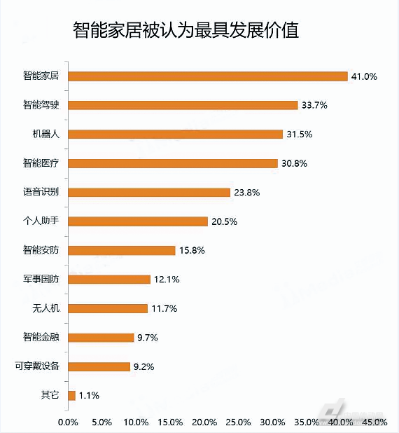 iiMediaResearch(艾媒咨詢)數(shù)據(jù)顯示,41.0%的手機網(wǎng)民認為智能家居是具發(fā)展價值(包括社會、經(jīng)濟等價值)的領域之一,見圖12,緊隨其后的是智能駕駛、機器人、智能醫(yī)療等,而僅為9.7%、9.2%的手機網(wǎng)民認為智能金融、可穿戴設備存在較大發(fā)展價值。