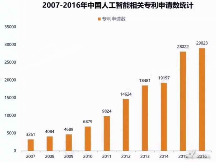 艾媒咨詢分析師認為,中國人工智能產業(yè)起步相對較晚,但產業(yè)布局、技術研究等基礎設施正處于進步期,隨著科技、制造等業(yè)界巨頭公司的布局深入,人工智能產業(yè)的規(guī)模將進一步擴大。而隨著眾多垂直領域的創(chuàng)業(yè)公司的誕生和成長,人工智能將出現(xiàn)更多的產業(yè)級和消費級應用產品。根據(jù)統(tǒng)計數(shù)據(jù),中國人工智能相關專利申請數(shù)從2010年開始出現(xiàn)持續(xù)增長,于2014年達到19197項,并于2015年開始大幅增長,達到28022項,2016年,中國人工智能相關專利年申請數(shù)為29023項,見圖3。