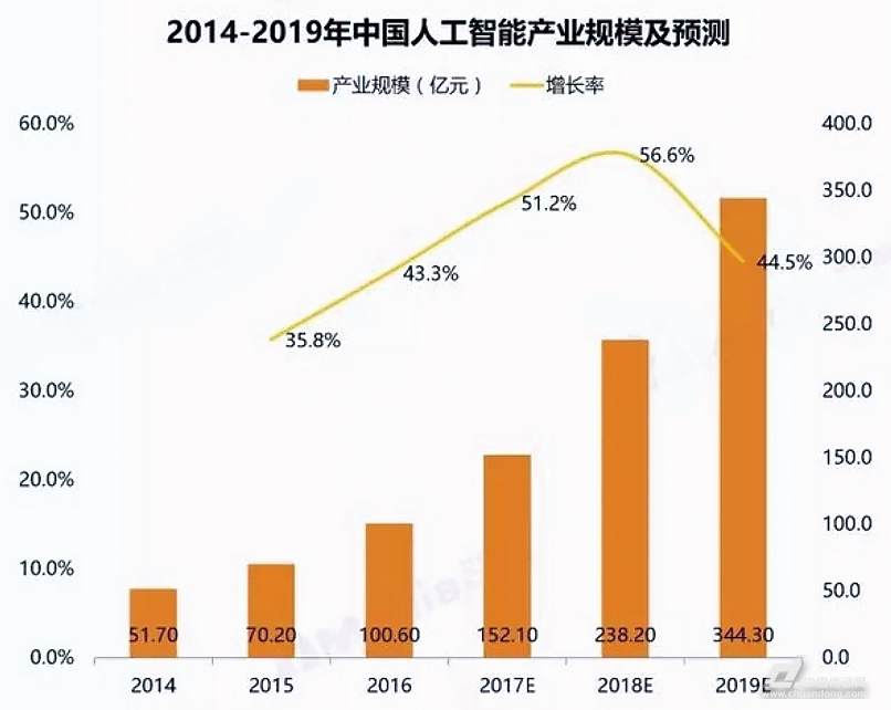 iiMediaResearch(艾媒咨詢)數(shù)據(jù)顯示,中國人工智能產業(yè)規(guī)模2016年已突破100億,以43.3%的增長率達到了100.60億元,預計2017年增長率將提高至51.2%,產業(yè)規(guī)模達到152.10億元,并于2019年增長至344.30億元,見圖2。