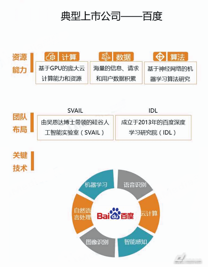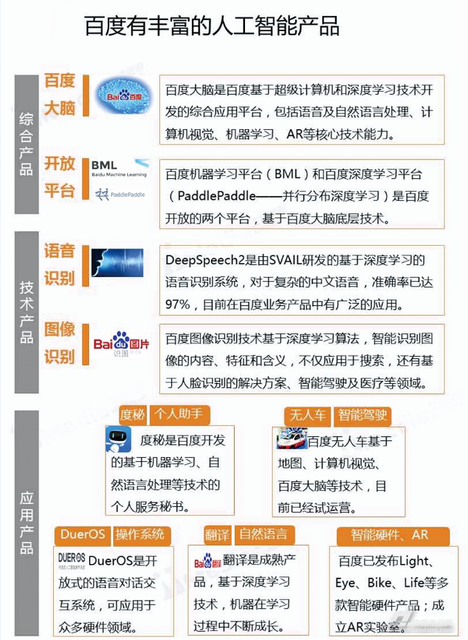 百度是較早布局人工智能的企業(yè)之一,自2013年起就開始投入研發(fā),人工智能是百度戰(zhàn)略和戰(zhàn)術上的核心,基于龐大的基礎數(shù)據(jù)和計算能力,有非常大的研究投入和團隊建設,涉及多項人工智能相關技術領域,目前已有多款成功產品。