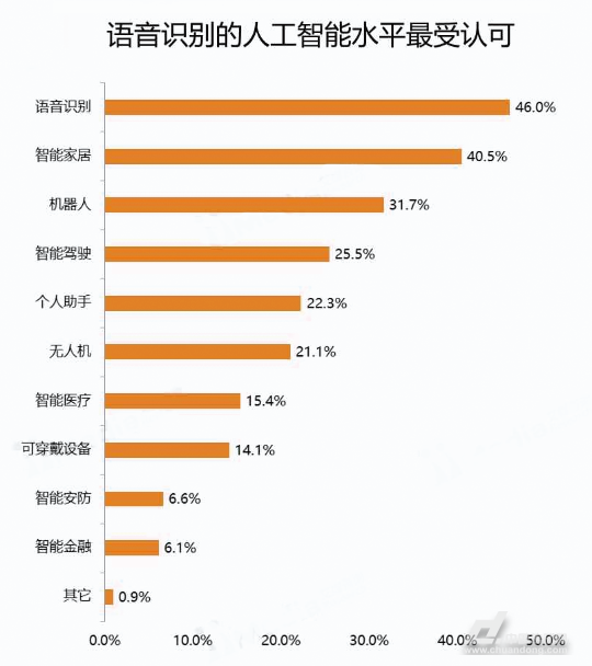 iiMediaResearch(艾媒咨詢)數(shù)據(jù)顯示,有46.0%的手機網(wǎng)民認為語音識別是人工智能發(fā)展水平較高的領域之一,見圖11,緊隨其后的是智能家居,得到了40.5%的手機網(wǎng)民的認可,而機器人、智能駕駛、個人助手、無人機等領域亦得到了較多的手機網(wǎng)民認可,其中,智能安防和智能金融的認可度較低。