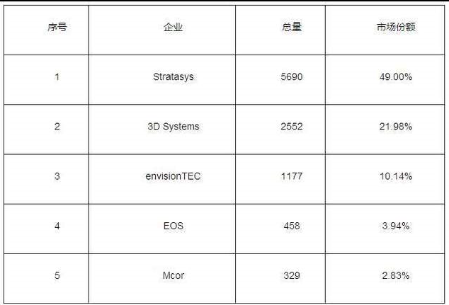 圖表:2015年全球工業(yè)級(jí)/專業(yè)級(jí)3D打印設(shè)備出貨量TOP5企業(yè)